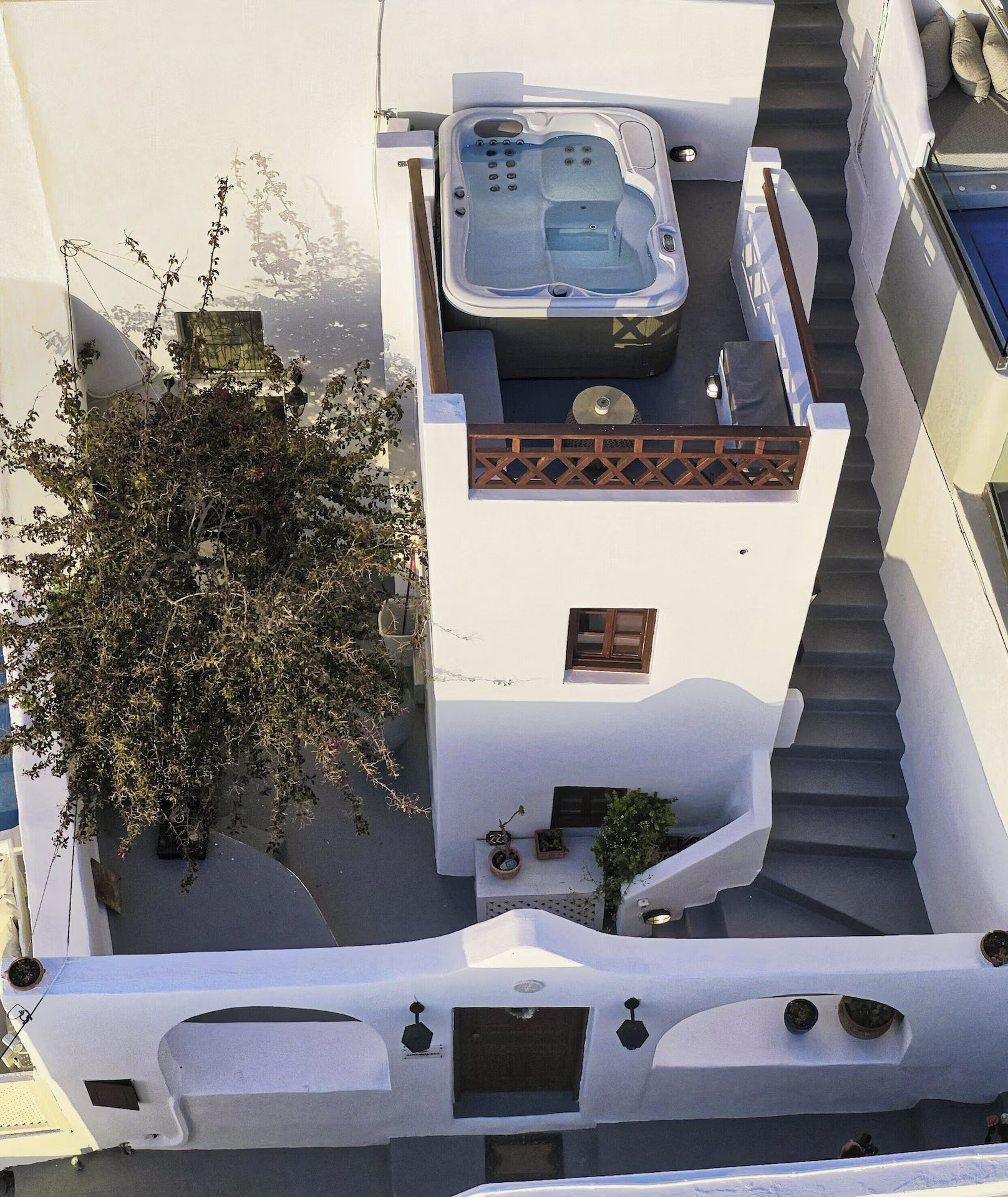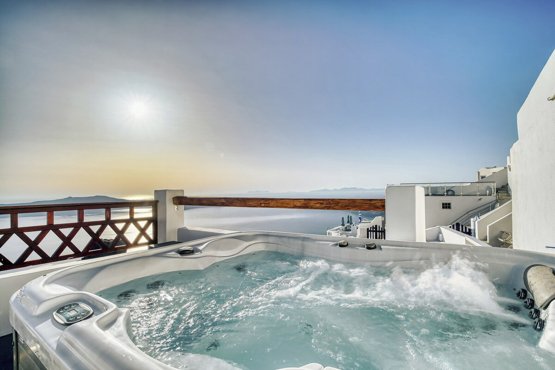 Ζήστε απολαυστικές στιγμές χαλάρωσης στο τζακούζι/υδρομασάζ στη βεράντα της σουίτας με θέα το απέραντο γαλάζιο του Αιγαίου και τα μαγευτικά χρώματα του διάσημου ηλιοβασιλέματος της Σαντορίνης παρέα με ένα μπουκάλι διάσημο τοπικό κρασί.
